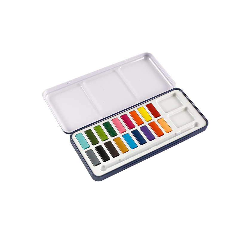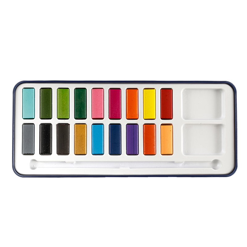 आमच्या वॉटर कलर सेट 18-पीसमध्ये विविध रंग आणि रंगछटांमध्ये उत्कृष्ट जलरंगांचा संच समाविष्ट आहे. रंगांचे हे मिश्रण सुरुवातीच्या कलाकारांसाठी तसेच ज्यांना त्यांचे रंग पॅलेट विस्तृत करायचे आहे त्यांच्यासाठी उत्तम आहे. वॉटर कलर बॉक्समध्ये 18 उच्च दर्जाच्या स्क्वेअर टॅब्लेट, एक पेंट ब्रश आणि तुमचा पुरवठा साठवण्यासाठी मेटल बॉक्स आहे!